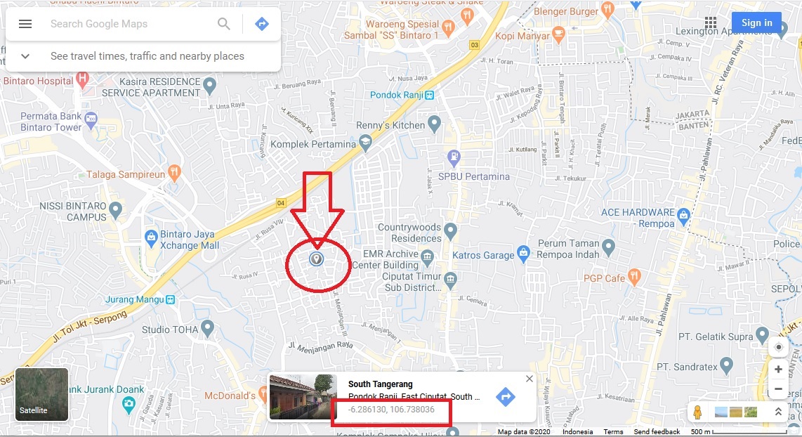 Koordinat akan muncul di kotak telusur di bagian atas.
